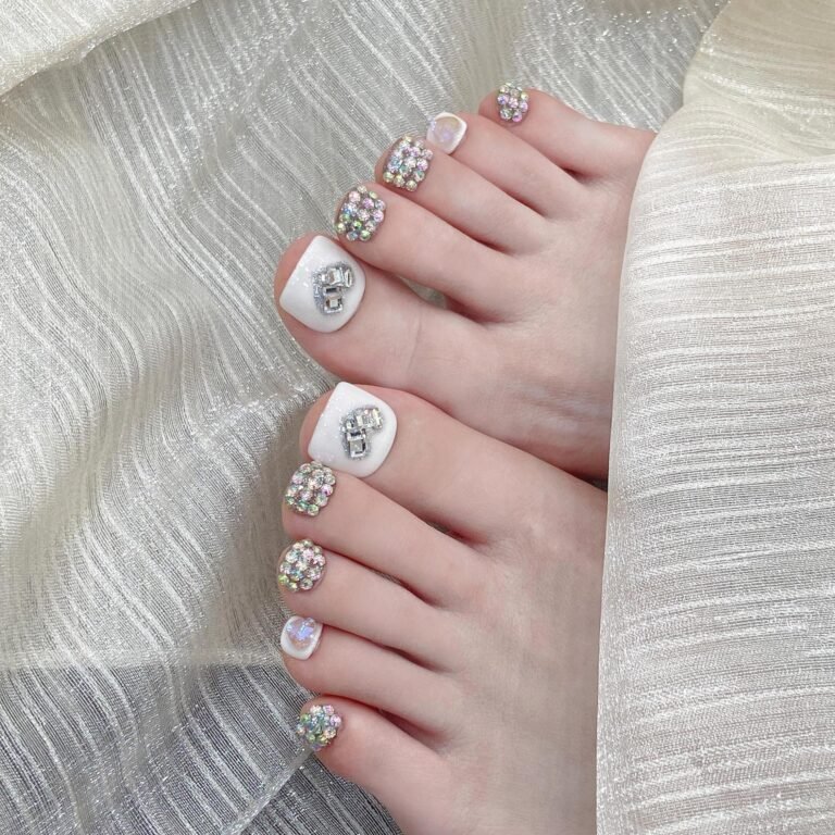 Wujasmine Press on nails Handmade foot wearable nails, white toenail with sequins, fair-skinned with rhinestones, sophisticated toenail art, new style for summer