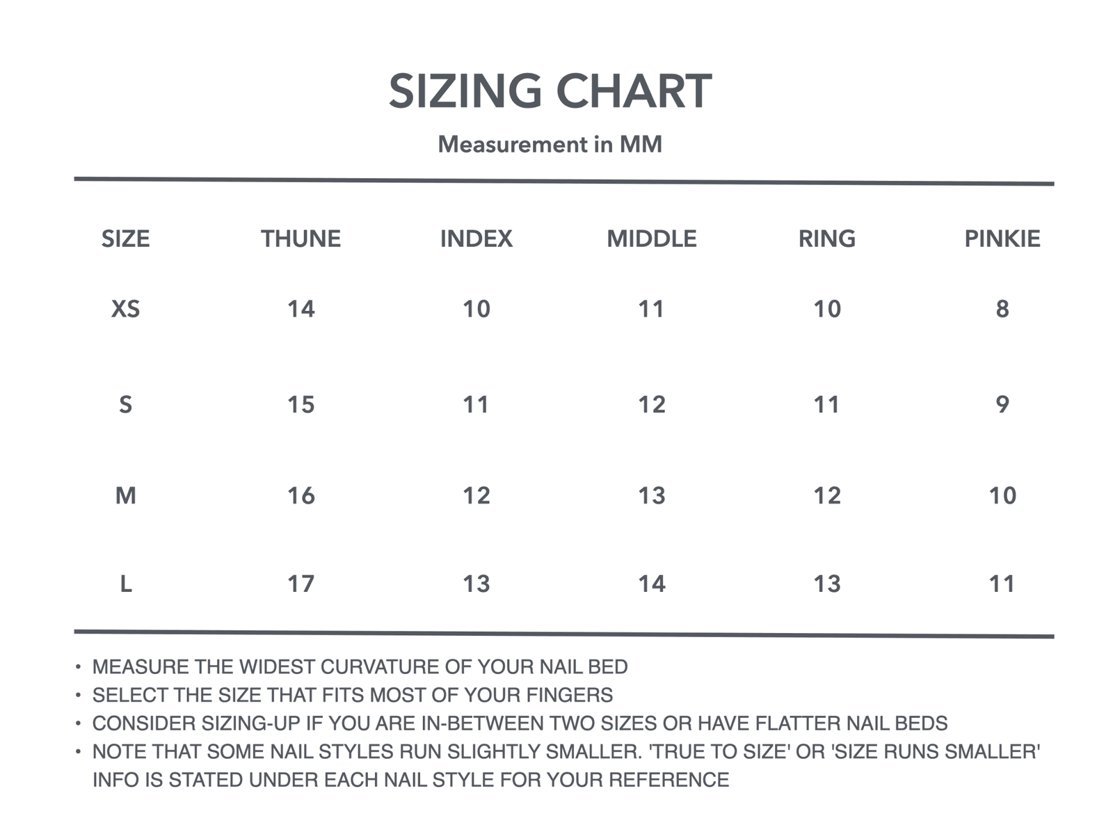 | Size | THUNE | INDEX | MIDDLE | RING | PINKIE |
