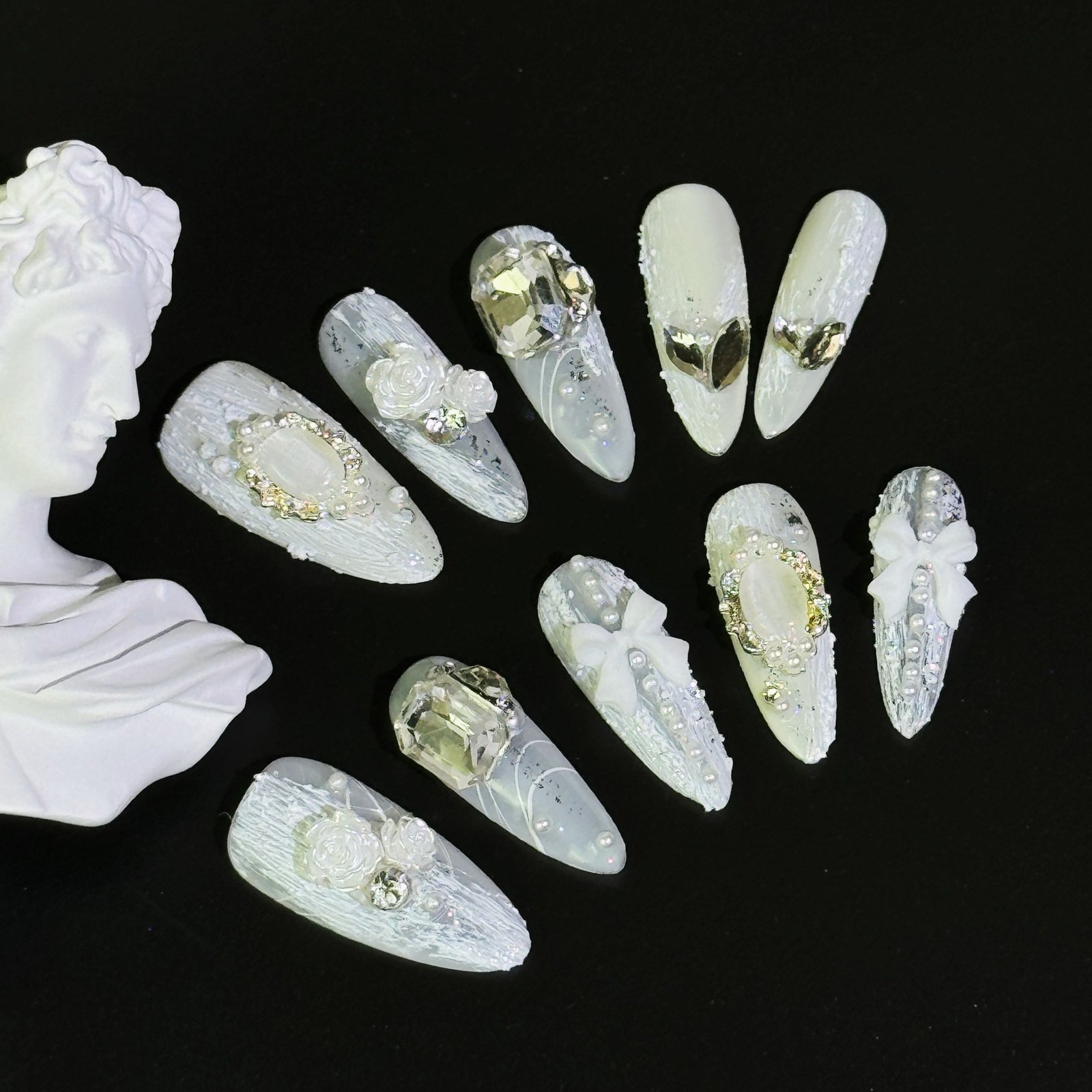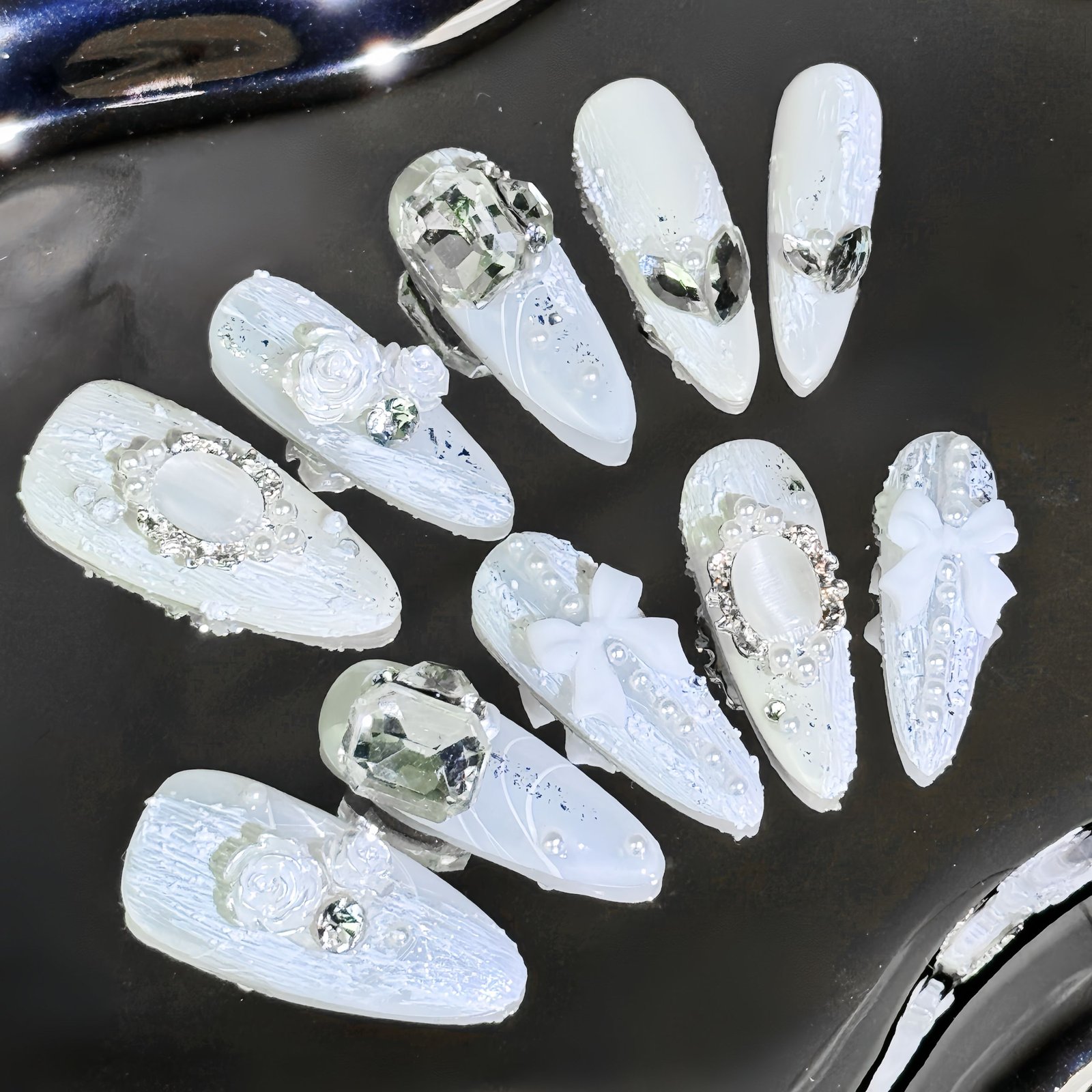 The nails are decorated with 3D bows, roses, pearls, and diamond designs, adding a touch of garden atmosphere and ambiance