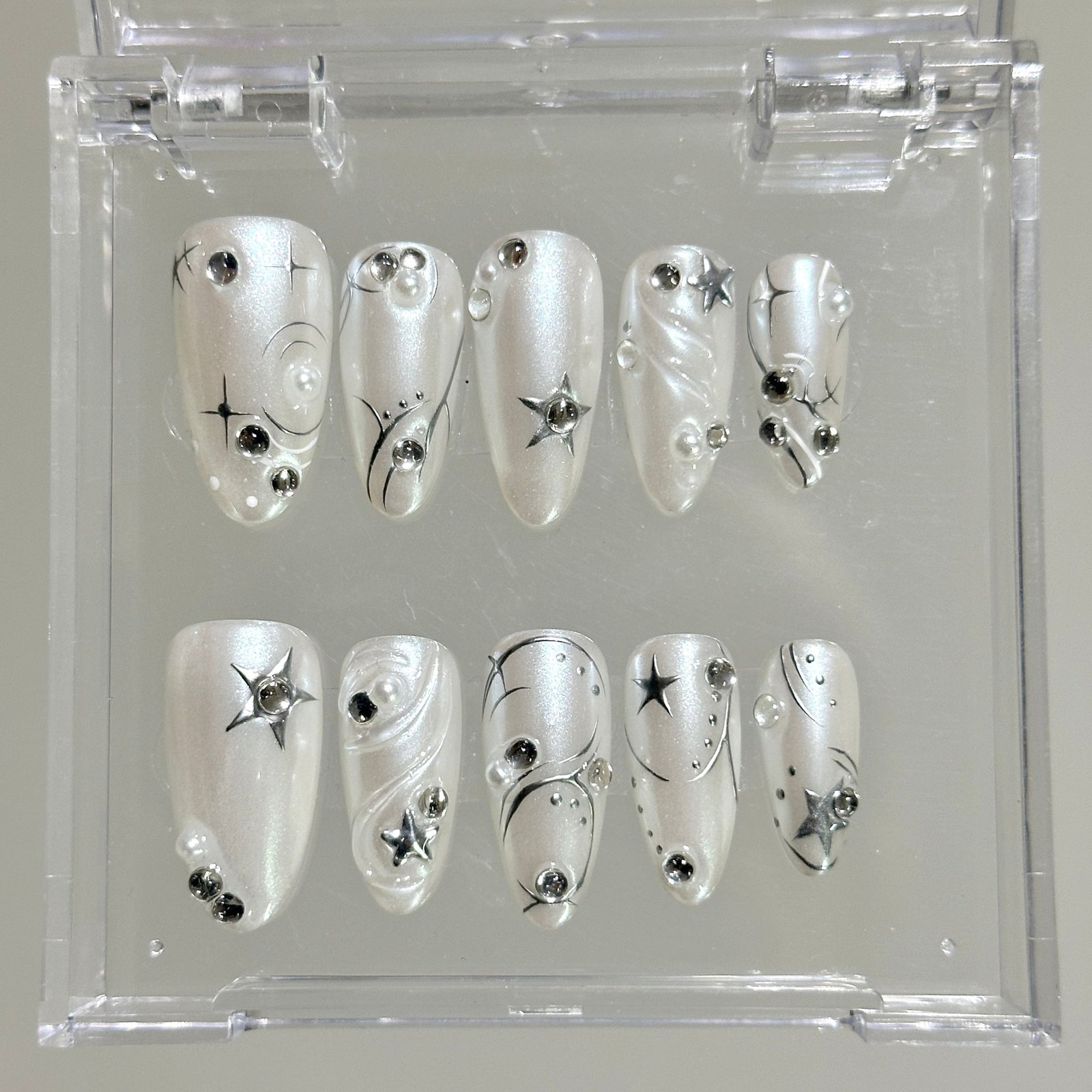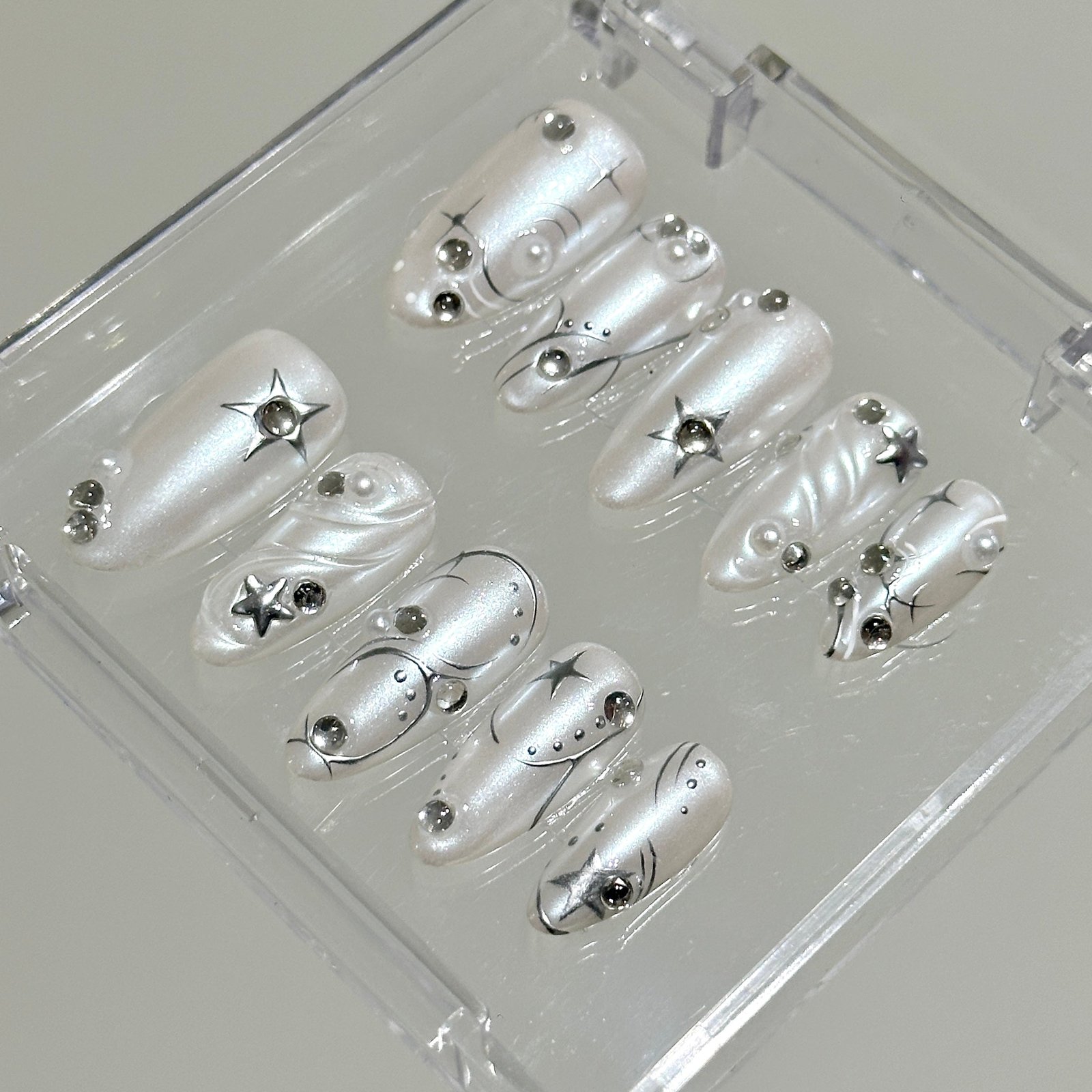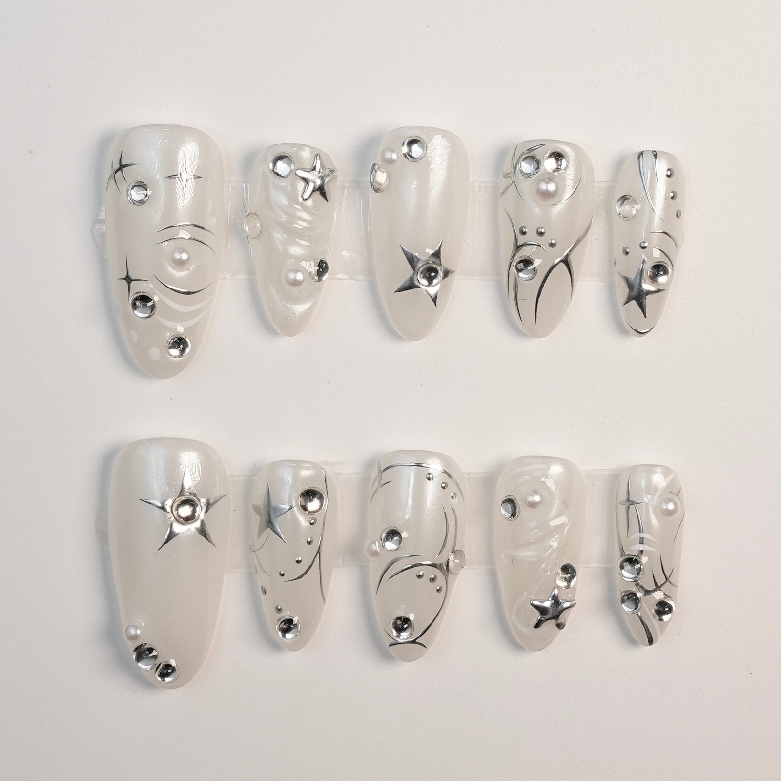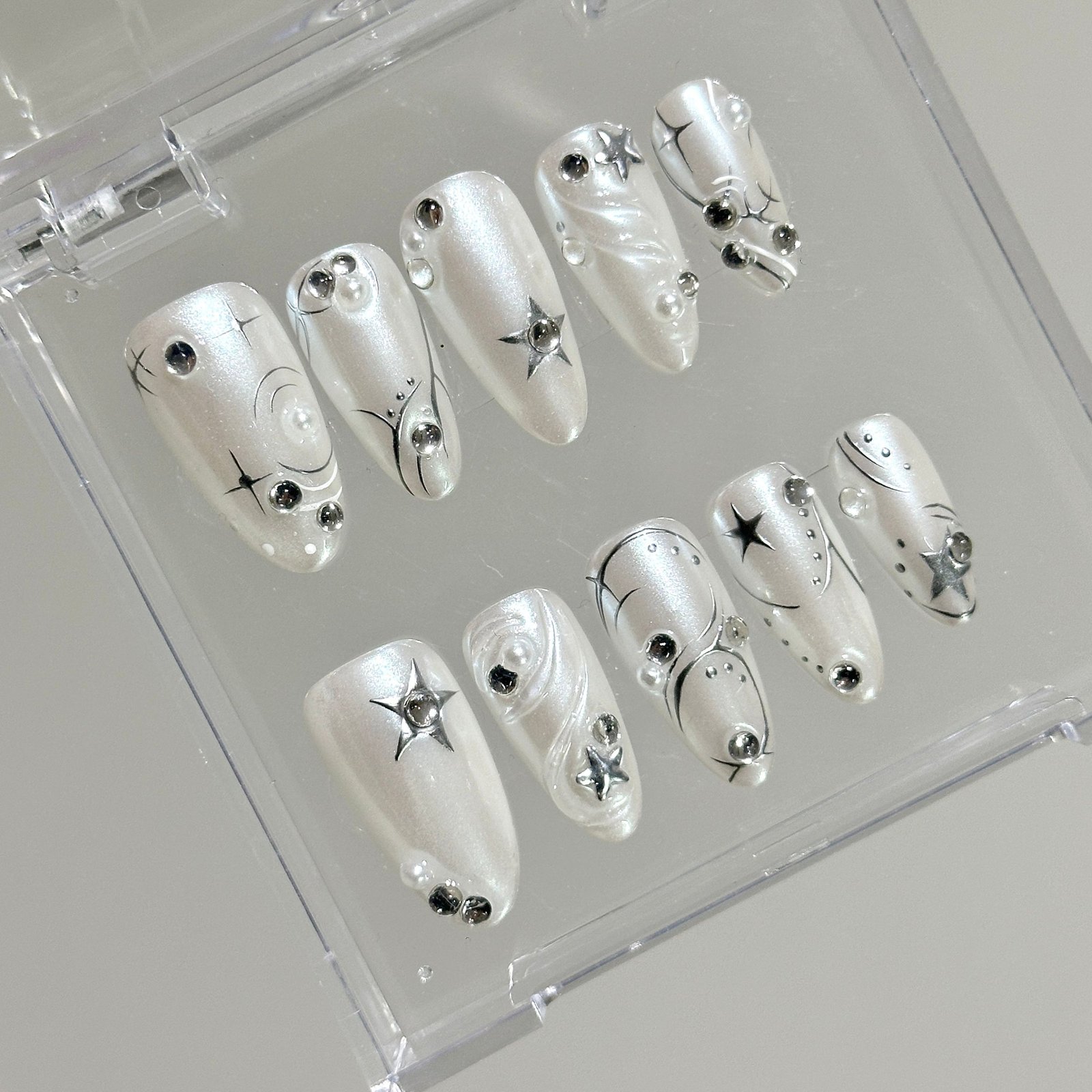 Hailey-style press-on nail set. featuring pearl white with silver lines. embodying a simple yet exquisite style.