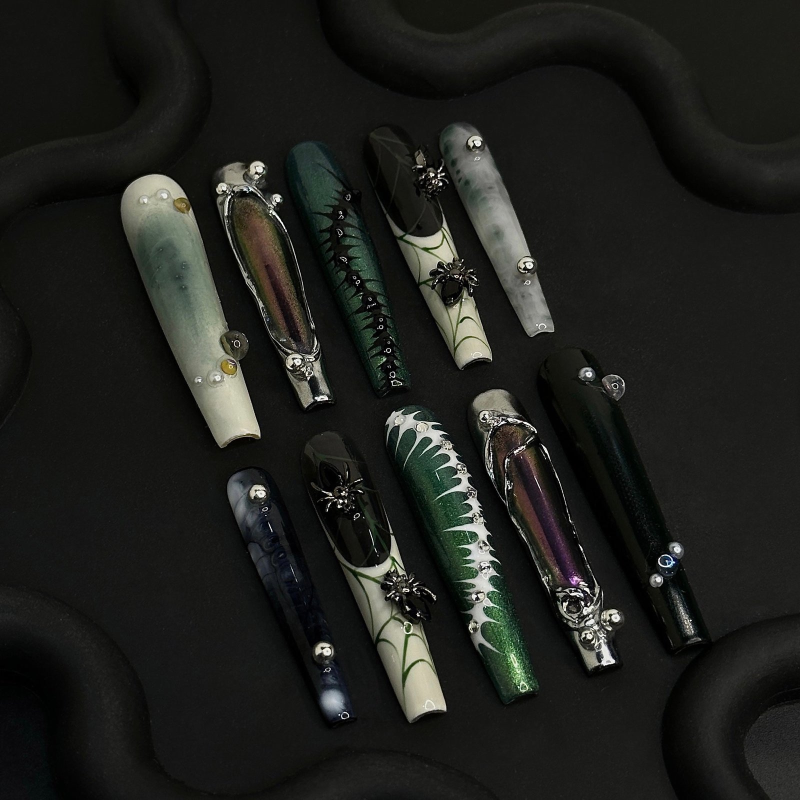 The overall design is rich in dark hues. with the designer incorporating black-green and metallic shades as the primary colors. The six-faceted 3D black diamonds are embedded to form the shape of a spider. The nail technician skillfully utilizes blending and painting techniques. harmoniously complementing the main colors with Whisper White.