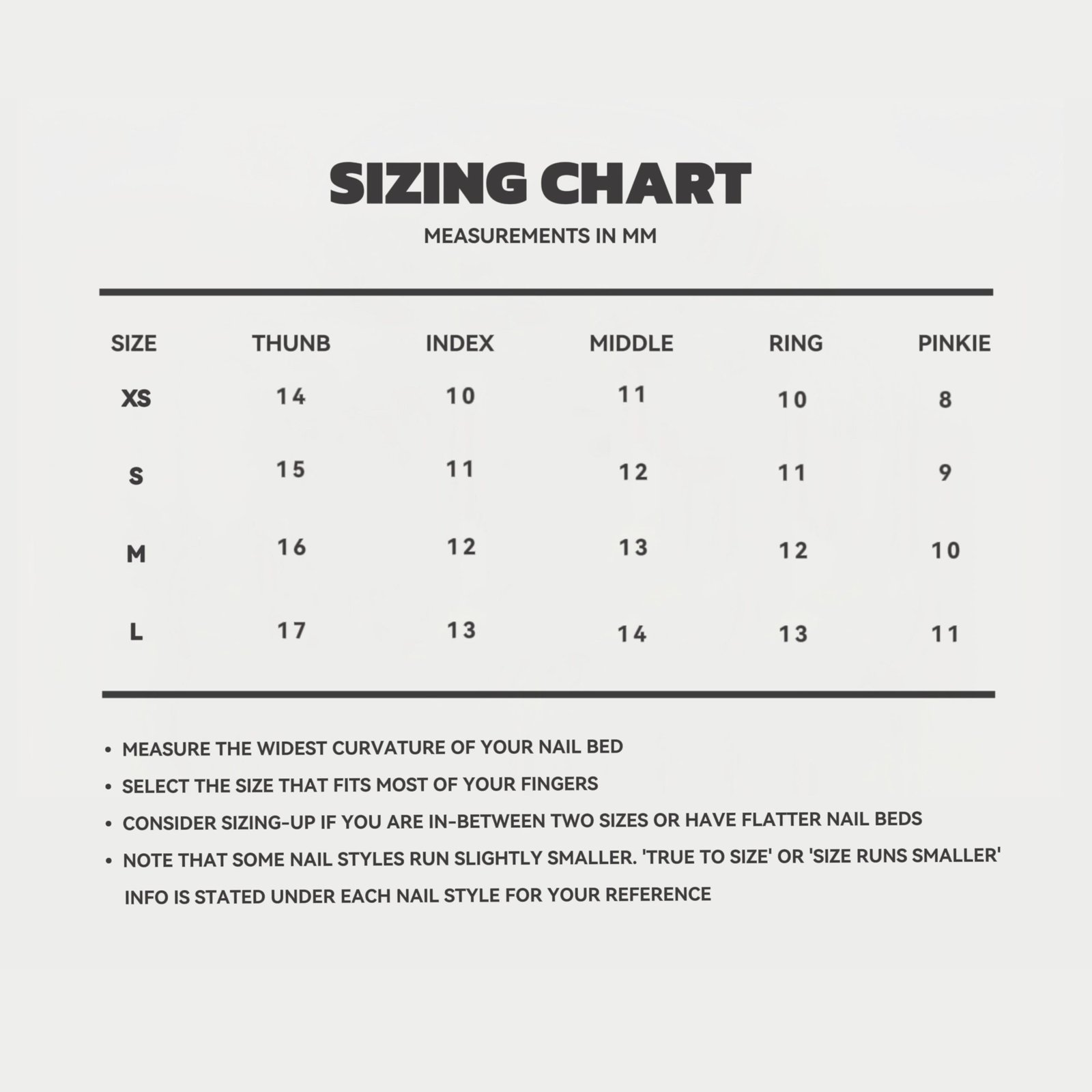 | Size | THUNE | INDEX | MIDDLE | RING | PINKIE |