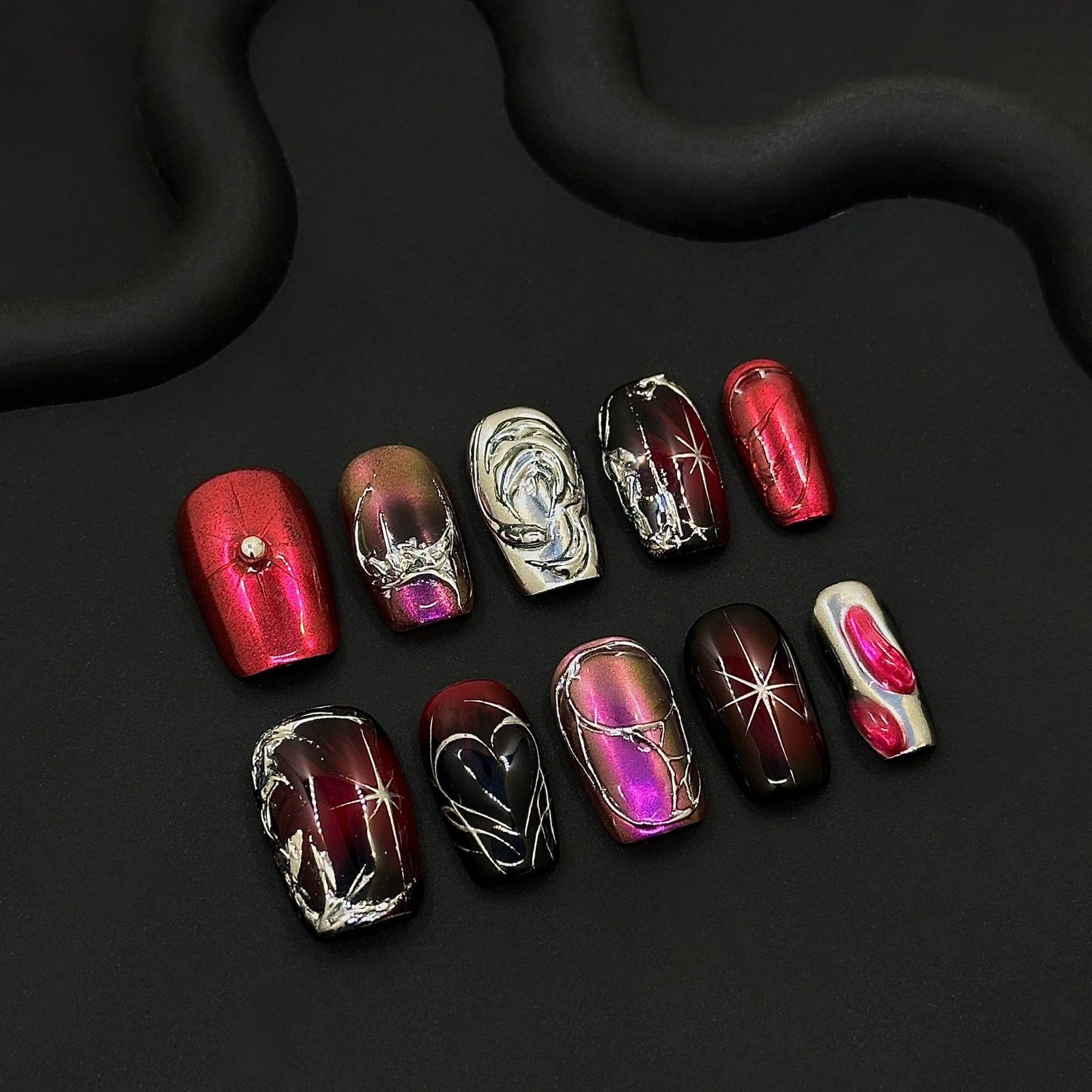 Ildarion is one of the distinctive designs under BLUEBERRYNAIL’s Characters theme. inspired by the rebirth of the phoenix. a female warrior wielding flames. The fusion of 3D hand-painted technique with magical mirror powder and aurora red evokes a powerful sense of strength.