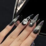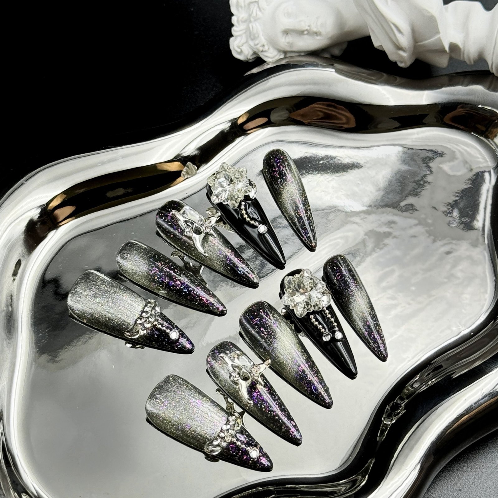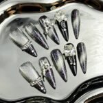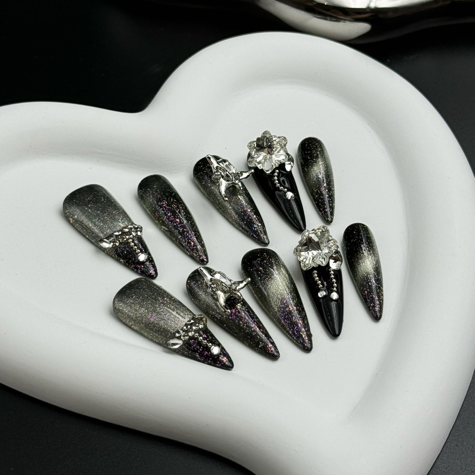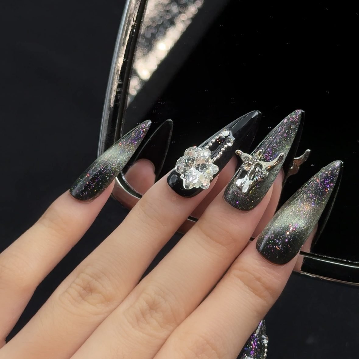Step into a realm of mystery and allure with “The Dark Queen.” This design features deep black tones adorned with silver sparkles and regal gemstones, perfect for those who embrace elegance with a touch of dark glamour. Ideal for evening events, parties, or a night out, the intricate jewel accents add a majestic, queen-like touch.